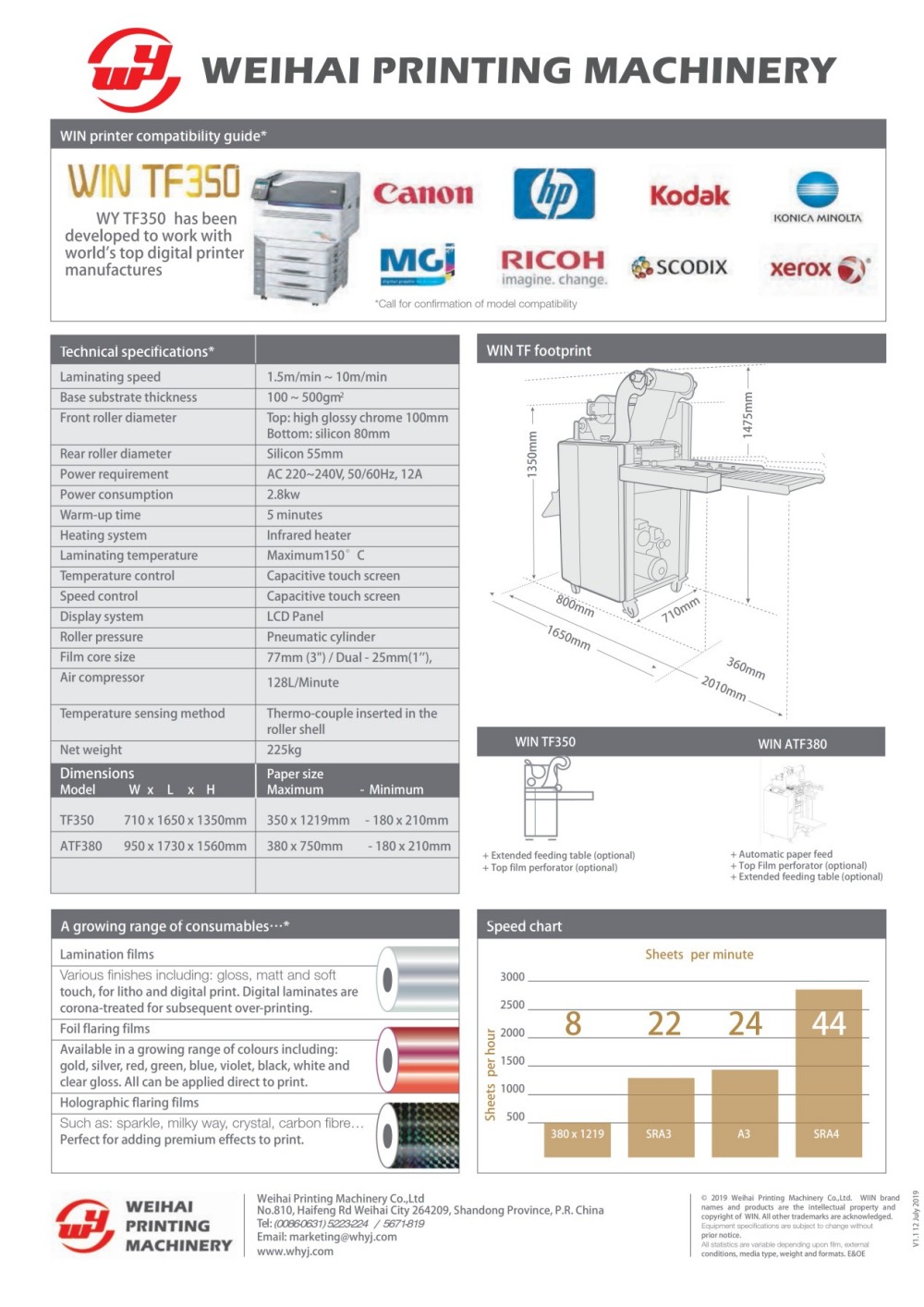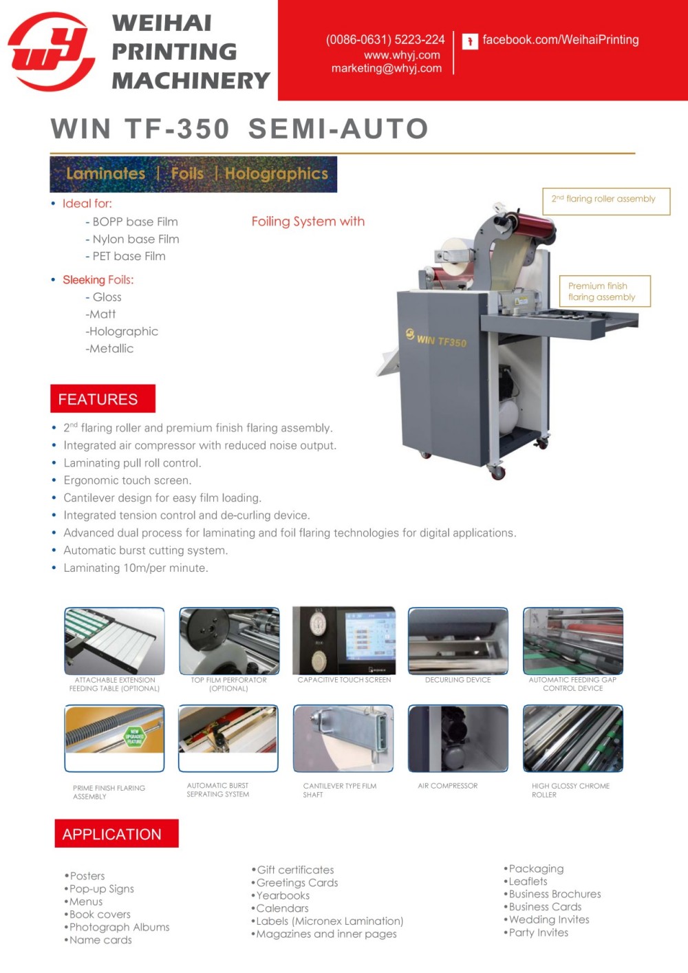 Manuaalisesti syötettävä laminointi- ja foliokone on Weihai Printing Machinery Co., Ltd:n suunnittelema ja valmistama manuaalinen paperinsyötön laminointi- ja metallifoliolaite. Kompaktin rakenteen ansiosta se säästää työpajatilaa ja integroi sekä laminointi- että metallifoliotoiminnot, mikä sopii yrityksille, jotka vaativat sisäistä koristekäsittelyä. Se voi muuntaa tavalliset painetut materiaalit korkealaatuisiksi hienoiksi lopputuotteiksi, ja se on täysin yhteensopiva sekä digitaalisten on-demand-sovellusten että perinteisten litografisten offsettulosteiden kanssa. Optimaalisen käsittelytuloksen varmistamiseksi kone on varustettu elektronisella ohjauslaitteella, joka säätää telan painetta ja kuumennuslämpötilaa käytön aikana avainmuuttujien, kuten käyntinopeuden, paperin paksuuden ja suunnittelukuvioiden, mukaan. Tehokkaan käsisyötteen kuumaleimaus- ja laminointilaitteistona sen on todistettu lisäävän merkittävästi asiakkaiden tuotteiden lisäarvoa. Asiakkaat voivat valita laajasta valikoimasta laminointikalvoja ja metallikalvoja erilaisiin sisustusvaatimuksiin. Lisäksi se on varustettu pidennetyllä paperinsyöttöpöydällä bannereita ja erikoispitkiä painomateriaaleja varten.