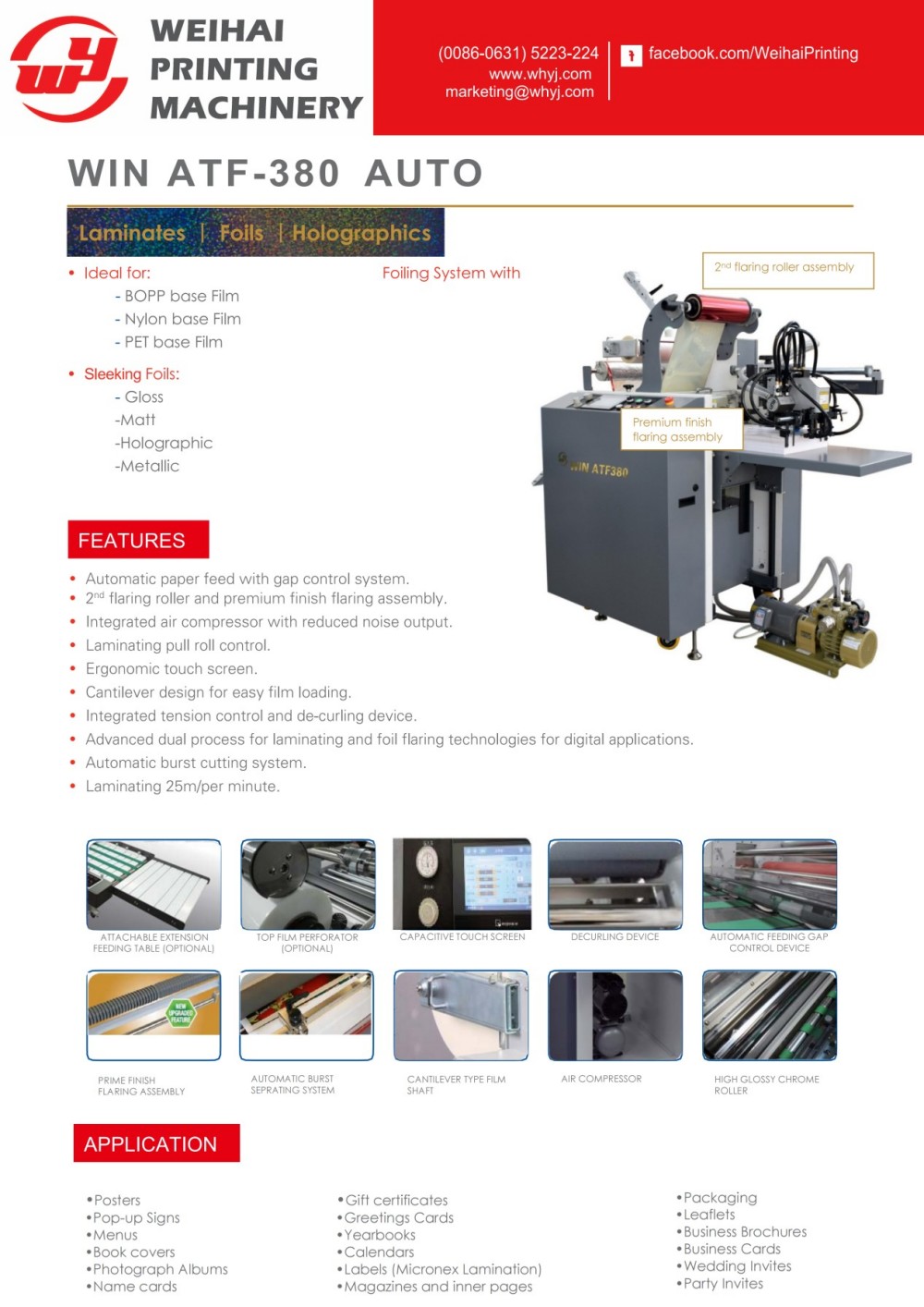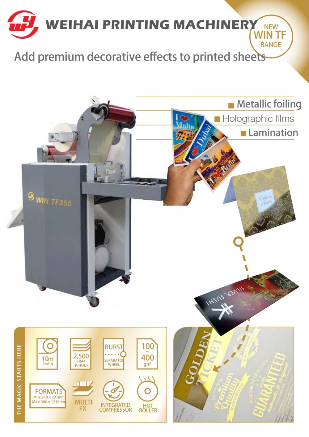 Weihai Printing Machinery Co., Ltd:n suunnittelema ja valmistama levyvalmistusvapaa laminointi- ja foliokone on manuaalinen paperinsyöttöinen laminointi- ja metallifoliokone. Sen kompakti muotoilu säästää tilaa ja pakkaa sekä laminointi- että metallifoliotoiminnoissa – ihanteellinen yrityksille, jotka haluavat lisätä koristeellisia yksityiskohtia talon sisällä. Se tekee tavallisista painomateriaaleista upeita lopputuotteita, jotka toimivat saumattomasti sekä digitaalisten on-demand-sovellusten että perinteisten litografisten offset-tulosteiden kanssa. Parhaan mahdollisen tuloksen saavuttamiseksi se on varustettu elektronisella ohjauslaitteella, joka säätää telan painetta ja lämmityslämpötilaa käytön aikana. Nämä säädöt perustuvat tekijöihin, kuten käyntinopeuteen, paperin paksuuteen ja suunnittelukuvioihin. Tämä kone on osoittautunut huippuluokan levyvalmistusvapaaksi kuumaleimaus- ja laminointityökaluksi, jonka avulla asiakkaat voivat lisätä tuotteisiinsa merkittävää arvoa. Asiakkailla on myös laaja valikoima laminointikalvoja ja metallikalvoja, joista he voivat vastata kaikkiin sisustustarpeisiinsa. Lisäksi siinä on laajennettu paperinsyöttöpöytä, joka sopii täydellisesti bannereille ja erikoispitkille painomateriaaleille.